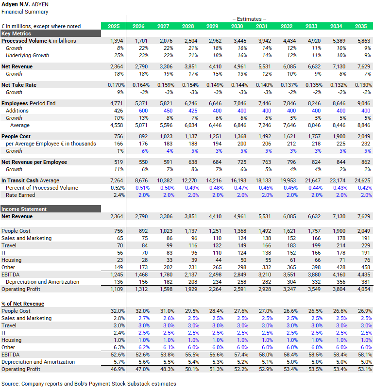 For 2026, I assume reported net revenue growth of 18%, which is down from my prior forecast of 20%, primarily reflecting a larger FX headwind. My 2026 net revenue estimate assumes 20% constant currency growth, at the low-end of Adyen’s guidance, with 2-points of FX headwind, larger in H1, and moderating in H2. On the expense side, I assume Adyen hires 600 net new employees ratably over the year and cost per employee rises by 6%, as Adyen hires disproportionately in more expensive markets, like the U.S., and for specialized skills. The end result is that people costs4 equal 32% of net revenue in 2026, similar to 2025, following a 310-bps decline from 2024 to 2025. With those changes, my EBITDA estimate falls to €1,468 million, down from my previous €1,548 million estimate. The 2026 EBITDA margin of 52.6% is dead even with 2025 and about 150-bps below my prior estimate.