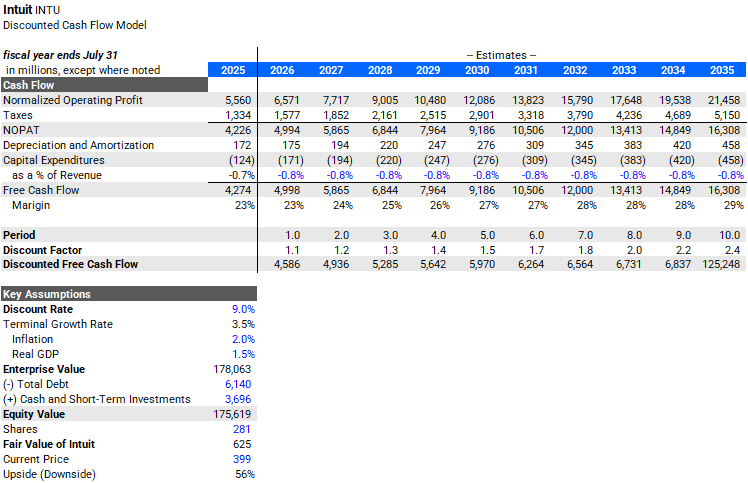 My fair value for Intuit is $625. Key assumptions for my DCF model include a tax rate of 24%, depreciation and amortization and capital expenditures that average less than 1% of revenue over the course of my forecast, a discount rate of 9%, which reflects Intuit’s strong financial position, mission-critical solutions, and fragmented customer base, which eliminates concentration risk and bestows pricing power, and a terminal growth rate of 3.5%, reflecting low single digit growth in both nominal GDP and inflation. Terminal value represents about 70% of total discounted cash flows.