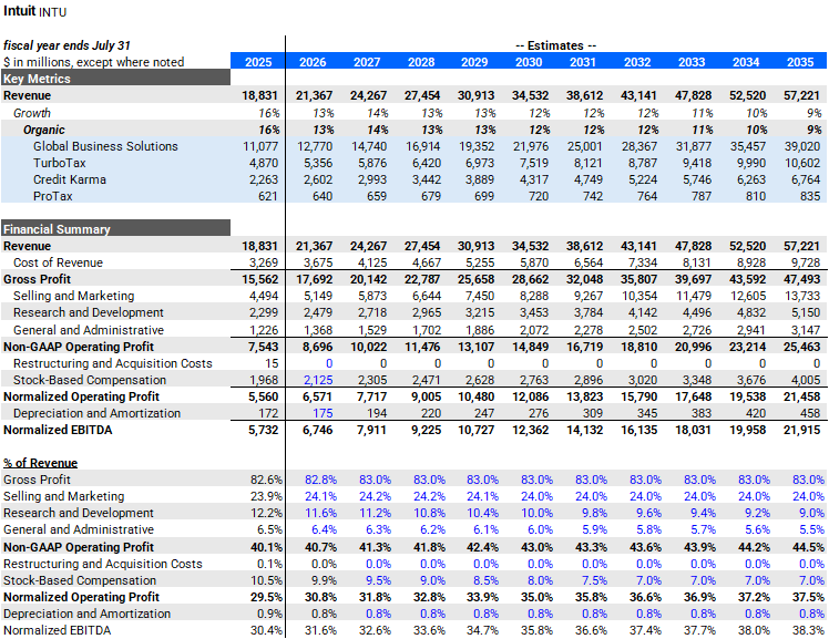 In the out years (fiscal 2030 to fiscal 2035), I assume revenue growth of 10.5% with 12% growth in Global Business Solutions, 7% growth in TurboTax, 9% growth in Credit Karma, and 3% ProTax growth. My normalized operating margin moves from 35% to 37.5% by fiscal 2035.
