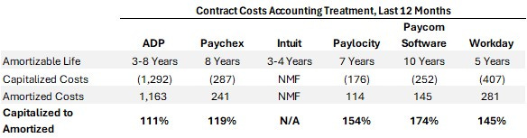 At 10 years, Paycom has the longest amortizable life for contract costs, which has the effect of overstating GAAP results relative to peers with shorter lives. For example, of the $252 million in capitalized contract costs added over the past year, Paycom will amortize $25 million in the upcoming year. If the life were 7 years, as for Paylocity, amortization would be $36 million, 43% higher.