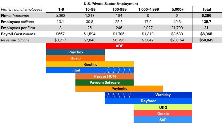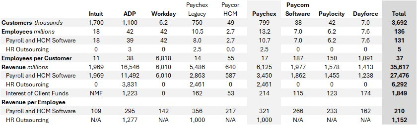 Across the industry, payroll and HCM software generates $210 of revenue per employee per year. A couple of observations (from the table below):