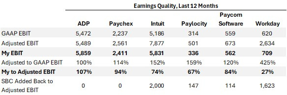 Earnings Quality. Much like payments, mature payroll and HCM companies (ADP and Paychex) have better earnings quality and make fewer adjustments to GAAP results. On the other hand, faster-growing payroll and HCM companies (Intuit, Workday, Paycom and Paylocity) have more add-backs, including significant stock-based compensation expense: