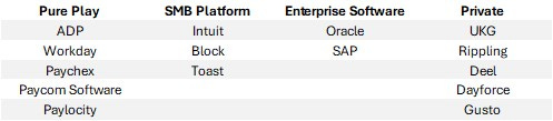 Intuit, ADP, Workday, Paychex, Paycom Software, and Paylocity