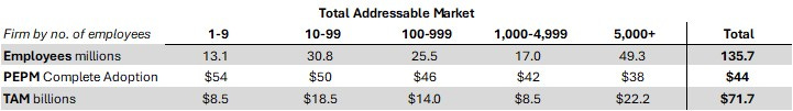 I estimate a U.S. payroll and HCM software TAM of $72 billion. This not too scientific estimate is informed primarily by individual company estimates, arrived at by multiplying the number of employees in a category by revenue potential from adoption of a full product suite. As the table below demonstrates, I assume a decline in per employee, per month pricing as client size increases. Overall, my estimate implies about $530 in annual payroll and HCM software revenue per employee, suggesting about 40% penetration based on the current $210.
