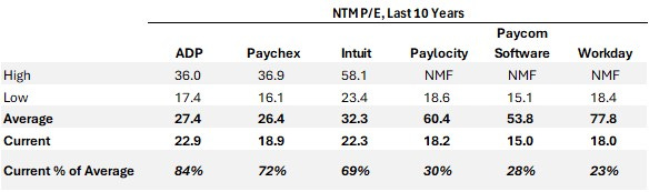 I’m less enthused about Workday (WDAY), Paycom Software (PAYC) and Paylocity (PCTY) given their valuations and exposure to enterprise customers (Workday) which are more susceptible to AI disruption, and the middle market (Paycom and Paylocity) where competition is heating up.