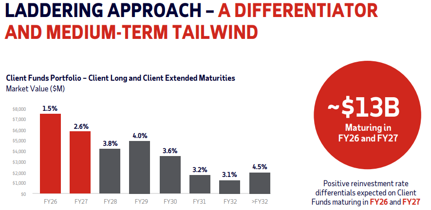 ADP invests client funds in longer-dated instruments, using short-term borrowings to meet client obligations. The practical effect of this strategy is that ADP will generate higher relative yield on its investment portfolio when short-term interest rates are low, and lower relative yield when short-term interest rates are high, as they have been for the past couple of years. Even so, with rates staying high, ADP will have the opportunity for positive reinvestment rates on $13 billion of its total $28 billion client funds extended and long portfolio over the next two years: